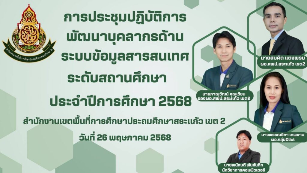 นายสมคิด แตงพรม ผู้อำนวยการ สพป.สระแก้ว เขต 2 เป็นประธานในการประชุม ปฎิบัติการ พัฒนาบุคลากรด้านระบบข้อมูลสารสนเทศ ระดับสถานศึกษา ประจำปีการศึกษา 2568 โดยมีนางพรรณวิภา เทพขาม นักวิเคราะห์นโยบายและแผนชำนาญการ ปฏิบัติหน้าที่ผู้อำนวยการกลุ่มส่งเสริมการศึกษาทางไกลเทคโนโลยีสารสนเทศและการสื่อสาร เป็นวิทยากรในการอธิบายแนวทางการจัดการประชุมปฎิบัติการพัฒนาบุคลากรด้านระบบข้อมูลสารสนเทศ ระดับสถานศึกษา ประจำปีการศึกษา 2568 ผ่านระบบการประชุมออนไลน์ เพื่อการบริหารจัดการและการวางแผน ประจำปีการศึกษา 2568 เพื่อให้ สอดคล้องกับ นโยบายในด้านลดภาระครูและบุคลากรทางการศึกษาเพื่อเพิ่มประสิทธิภาพการบริหารงานด้านสารสนเทศเพื่อการบริหารและการจัดการสำหรับครูและบุคลากรทางการศึกษา