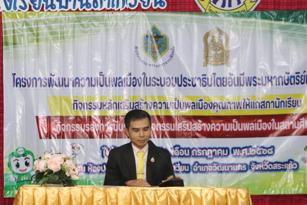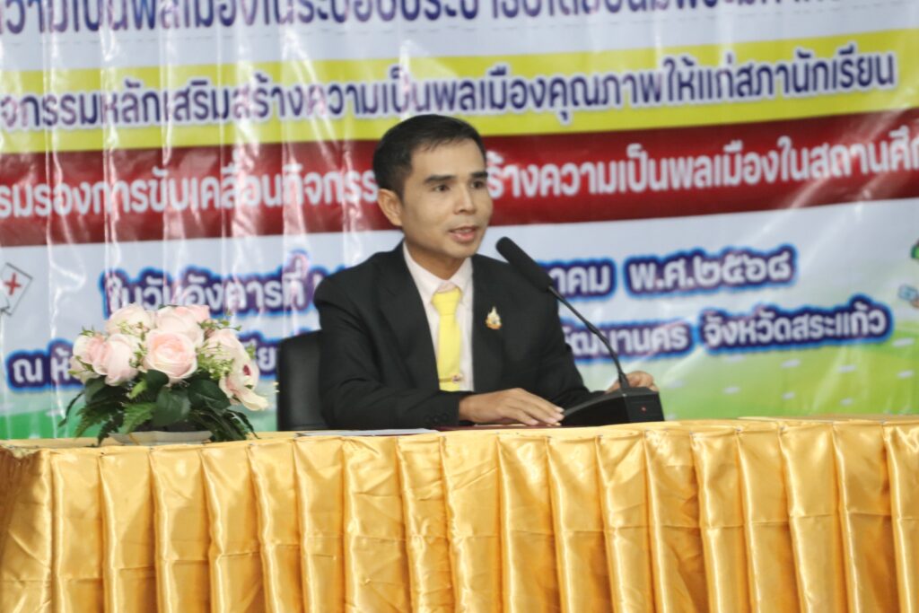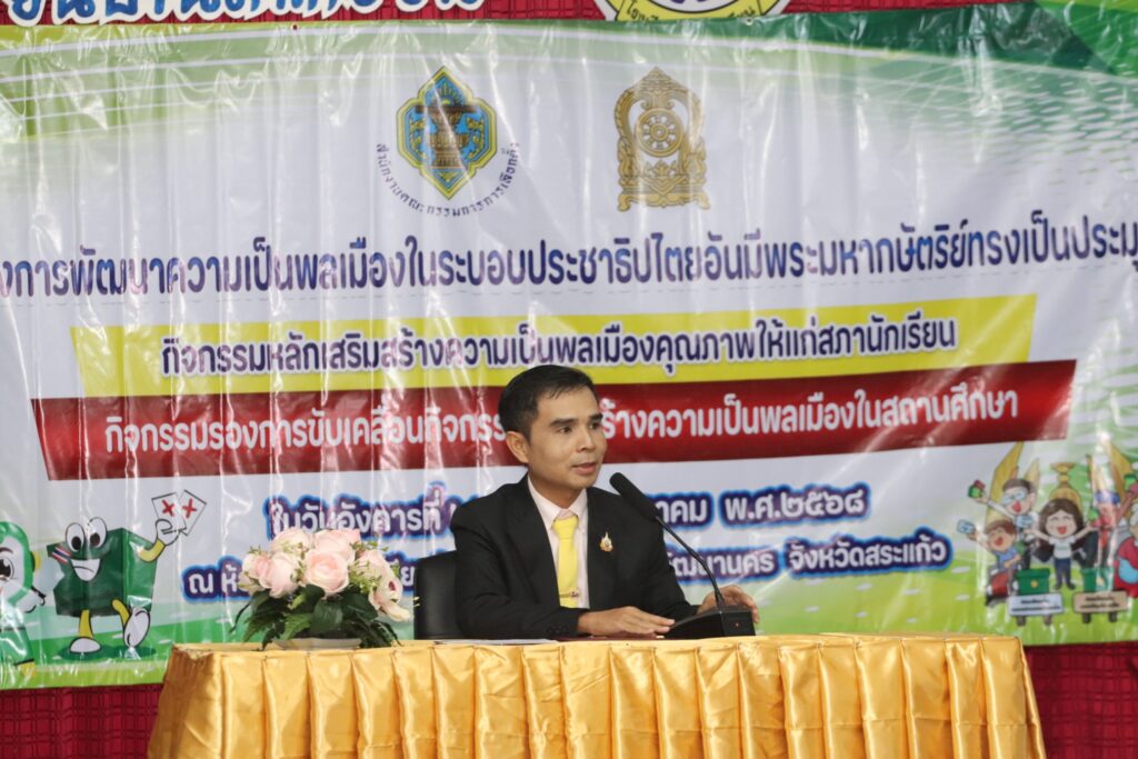 สํานักงาน คณะกรรมการการเลือกตั้งประจําจังหวัดสระแก้ว ดําเนินการโครงการพัฒนาความเป็นพลเมืองในระบอบ ประชาธิปไตย อันมีพระมหากษัตริย์ทรงเป็นประมุข กิจกรรมหลักที่ 8 เสริมสร้างความเป็นพลเมืองคุณภาพ ให้แก่สภานักเรียน กิจกรรมรองที่ 8.3 การขับเคลื่อนกิจกรรมเสริมสร้างความเป็นพลเมืองในสถานศึกษา