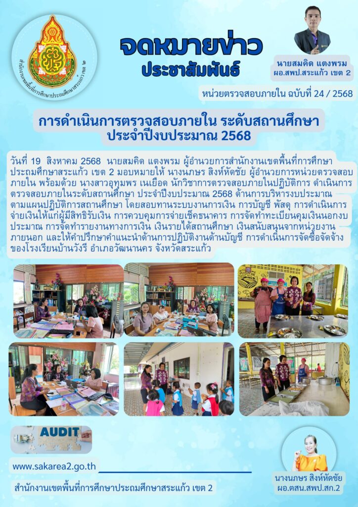 วันที่ 19 สิงหาคม 2568 นายสมคิด แตงพรม ผู้อำนวยการสำนักงานเขตพื้นที่การศึกษาประถมศึกษาสระแก้ว เขต 2 มอบหมายให้ นางนภษร สิงห์หัดชัย ผู้อำนวยการหน่วยตรวจสอบภายใน พร้อมด้วย นางสาวอุทุมพร เนเยือด นักวิชาการตรวจสอบภายในปฏิบัติการ ดำเนินการตรวจสอบภายในระดับสถานศึกษา ประจำปีงบประมาณ 2568 ด้านการบริหารงบประมาณ ตามแผนปฏิบัติการสถานศึกษา โดยสอบทานระบบงานการเงิน การบัญชี พัสดุ การดำเนินการจ่ายเงินให้แก่ผู้มีสิทธิรับเงิน การควบคุมการจ่ายเช็คธนาคาร การจัดทำทะเบียนคุมเงินนอกงบประมาณ การจัดทำรายงานทางการเงิน เงินรายได้สถานศึกษา เงินสนับสนุนจากหน่วยงานภายนอก และให้คำปรึกษาคำแนะนำด้านการปฏิบัติงานด้านบัญชี การดำเนินการจัดซื้อจัดจ้าง ของโรงเรียนบ้านวังรี อำเภอวัฒนานคร จังหวัดสระแก้ว