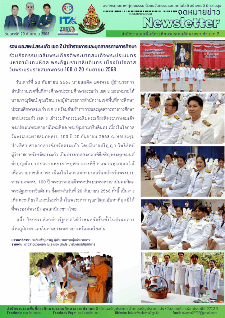 วันเสาร์ที่ 20 กันยายน 2568 นายสมคิด แตงพรม ผู้อำนวยการสำนักงานเขตพื้นที่การศึกษาประถมศึกษาสระแก้ว เขต 2 มอบหมายให้นายภาณุวัฒน์ คุณเวียน รองผู้อำนวยการสำนักงานเขตพื้นที่การศึกษาประถมศึกษาสระแก้ว เขต 2 พร้อมด้วยข้าราชการและบุคลากรทางการศึกษา สพป.สระแก้ว เขต 2 เข้าร่วมกิจกรรมเฉลิมพระเกียรติพระบาทสมเด็จพระปรเมนทรมหาอานันทมหิดล พระอัฐมรามาธิบดินทร เนื่องในโอกาสวันพระบรมราชสมภพครบ 100 ปี 20 กันยายน 2568 ณ หอประชุมปางสีดา ศาลากลางจังหวัดสระแก้ว โดยมีนายปริญญา โพธิสัตย์ ผู้ว่าราชการจังหวัดสระแก้ว เป็นประธานประกอบพิธีเจริญพระพุทธมนต์ ทำบุญตักบาตรถวายพระราชกุศล และพิธีวางพานพุ่มดอกไม้เพื่อถวายราชสักการะ เนื่องในโอกาสมหามงคลวันคล้ายวันพระบรมราชสมภพครบ 100 ปี พระบาทสมเด็จพระปรเมนทรมหาอานันทมหิดล พระอัฐมรามาธิบดินทร ซึ่งตรงกับวันที่ 20 กันยายน 2568 ทั้งนี้ เป็นการเทิดพระเกียรติและน้อมรำลึกในพระมหากรุณาธิคุณอันหาที่สุดมิได้ที่พระองค์ทรงมีต่อพสกนิกรชาวไทย