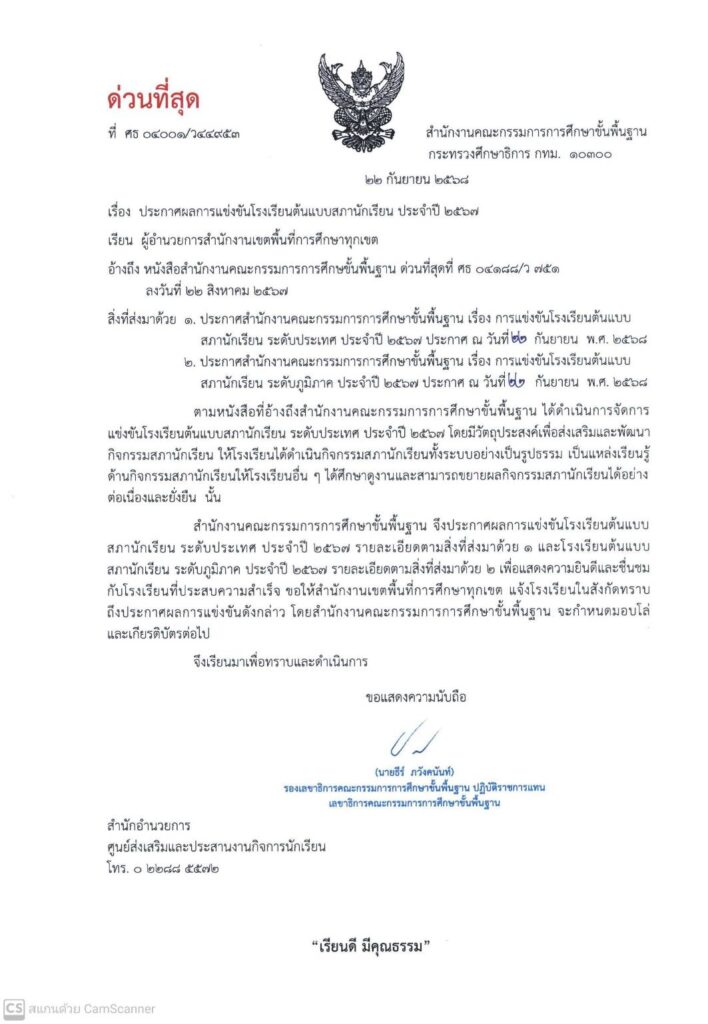 ทั้งนี้ จากประกาศผลการแข่งขันโรงเรียนต้นแบบสภานักเรียน ประจำปี 2567 โดยสำนักงานคณะกรรมการการศึกษาขั้นพื้นฐาน ได้ประกาศรายชื่อโรงเรียนต้นแบบสภานักเรียน ระดับภูมิภาค ประจำปี 2567 จำนวน 13 โรงเรียน และแจ้งให้สำนักงานเขตพื้นที่การศึกษาทุกเขตแจ้งไปยังโรงเรียนในสังกัดได้ทราบถึงประกาศผลการแข่งขันดังกล่าว โดย สพฐ. จะมีการกำหนดมอบโล่และเกียรติบัตรเป็นลำดับต่อไป