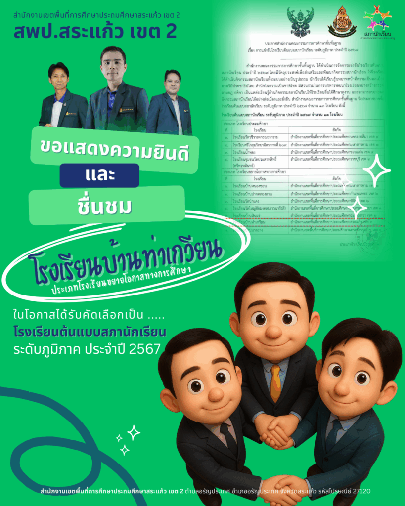 ผู้บริหารการศึกษา ผู้บริหารสถานศึกษา คณะครูและบุคลากรทางการศึกษา สำนักงานเขตพื้นที่การศึกษาประถมศึกษาสระแก้ว เขต 2 ขอแสดงความยินดีและชื่นชมโรงเรียนบ้านท่าเกวียน เนื่องในโอกาสได้รับคัดเลือกเป็น “โรงเรียนต้นแบบสภานักเรียน” ระดับภูมิภาค ประจำปี 2567 ประเภทโรงเรียนขยายโอกาสทางการศึกษา สังกัดสำนักงานเขตพื้นที่การศึกษาประถมศึกษาสระแก้วเขต 2