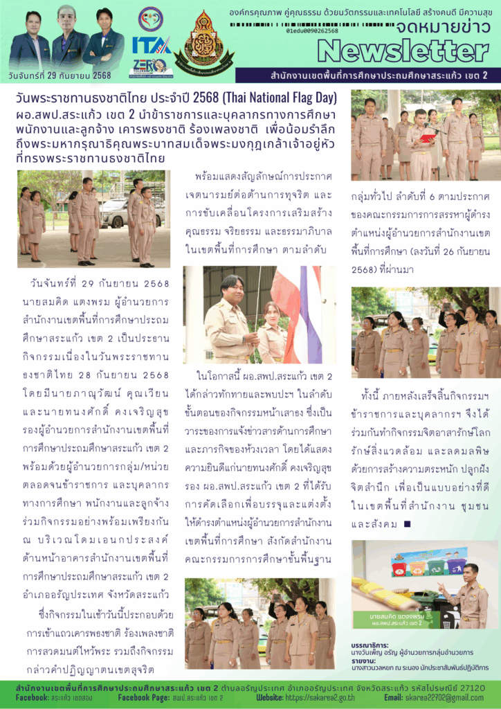 วันจันทร์ที่ 29 กันยายน 2568 นายสมคิด แตงพรม ผู้อำนวยการสำนักงานเขตพื้นที่การศึกษาประถมศึกษาสระแก้ว เขต 2 เป็นประธานกิจกรรมเนื่องในวันพระราชทานธงชาติไทย 28 กันยายน 2568 โดยมีนายภาณุวัฒน์ คุณเวียน และนายทนงศักดิ์ คงเจริญสุข รองผู้อำนวยการสำนักงานเขตพื้นที่การศึกษาประถมศึกษาสระแก้ว เขต 2 พร้อมด้วยผู้อำนวยการกลุ่ม/หน่วย ตลอดจนข้าราชการ และบุคลากรทางการศึกษา พนักงานและลูกจ้าง ร่วมกิจกรรมอย่างพร้อมเพรียงกัน ณ บริเวณโดมเอนกประสงค์ ด้านหน้าอาคารสำนักงานเขตพื้นที่การศึกษาประถมศึกษาสระแก้ว เขต 2 อำเภออรัญประเทศ จังหวัดสระแก้ว