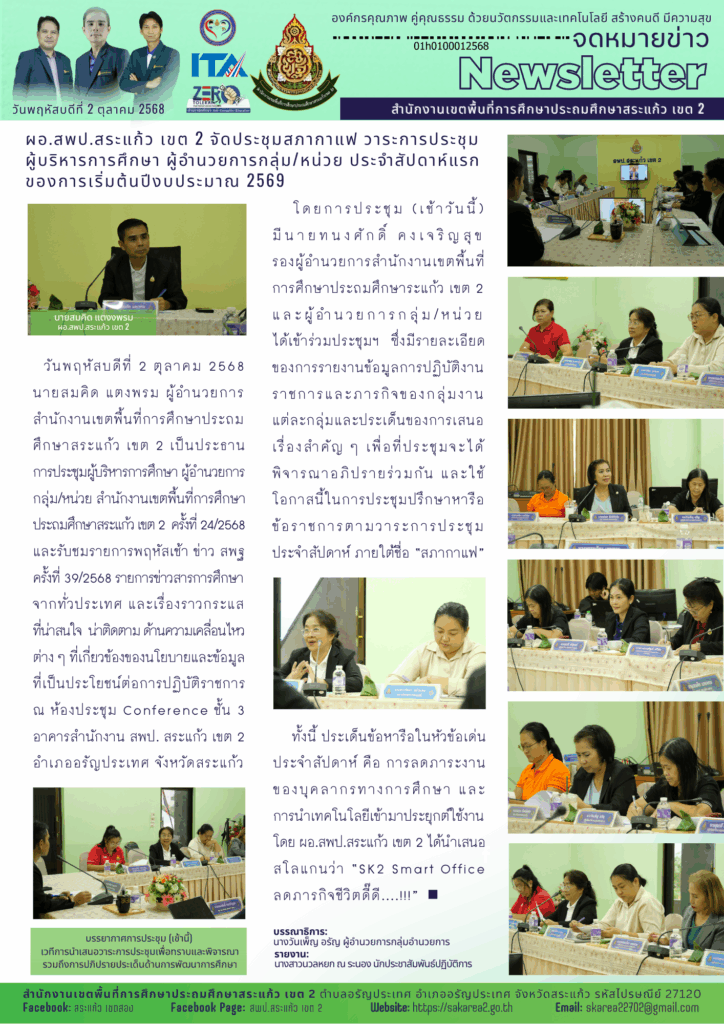 นายสมคิด แตงพรม ผอ.สพป.สระแก้ว เขต 2 ประชุมขับเคลื่อนนโยบายลดภาระงานบุคลากรในสังกัด ผสานเทคโนโลยีประยุกต์ใช้งาน ยกระดับงานสำนักงาน “SK2 Smart Office ลดภารกิจ ชีวิตดี๊ดี!!!!…” ในการประชุมสภากาแฟ วาระการประชุมผู้บริหารการศึกษา ผู้อำนวยการกลุ่ม/หน่วย ประจำสัปดาห์แรกของการเริ่มต้นปีงบประมาณ 2569 พร้อมรับชมรายการ “พฤหัสเช้า ข่าว สพฐ. ครั้งที่ 39/2568” ติดตามข่าวสารการศึกษาจากทั่วประเทศ ผ่านช่องทาง Obec Channel ระบุเตรียมจัดวาระ “ผอ. พบเพื่อนครู” เร็ว ๆ นี้