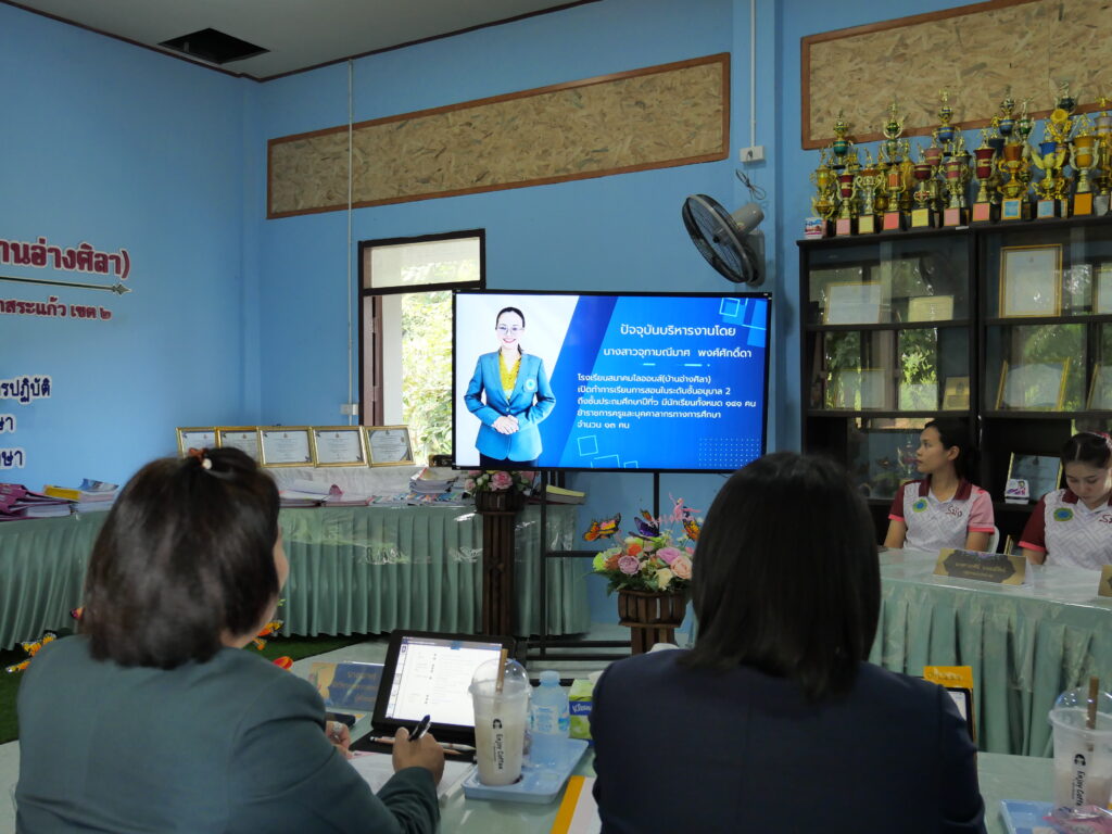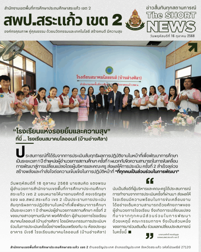 วันพฤหัสบดีที่ 16 ตุลาคม 2568 นายสมคิด แตงพรม ผู้อำนวยการสำนักงานเขตพื้นที่การศึกษาประถมศึกษาสระแก้ว เขต 2 มอบหมายให้นายทนงศักดิ์ คงเจริญสุข รอง ผอ.สพป.สระแก้ว เขต 2 เป็นประธานการประเมินสัมฤทธิผลการปฏิบัติงานในหน้าที่เพื่อพัฒนาการศึกษา เป็นระยะเวลา 1 ปี ตำแหน่งผู้อำนวยการสถานศึกษา ครั้งที่ 2 ของนางสาวจุฑามณีมาศ พงศ์ศักดิ์ดา ผู้อำนวยการโรงเรียนสมาคมไลออนส์ (บ้านอ่างศิลา) โดยมีคณะกรรมการประเมินฯ ร่วมในการประเมินครั้งนี้อย่างพร้อมเพรียงกัน ณ ห้องประชุม อาคาร บีเจซี โรงเรียนสมาคมไลออนส์ (บ้านอ่างศิลา)