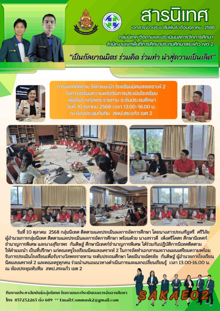 การนิเทศติดตาม ให้คำแนะนำ โรงเรียนนิคมสงเคราะห์ 2ในการเตรียมความพร้อรับการประเมินโรงเรียนเพื่อรับรางวัลพระราชทาน ระดับประถมศึกษา ตุลาคม 20, 2025ตุลาคม 20, 2025 นิเทศติดตามและประเมินผล กลุ่มนิเทศติดตามฯ, วารสาร ประชาสัมพันธ์ วันที่ 10 ตุลาคม 2568 เวลา 13.00-16.00 น.ณ ห้องประชุมทับทิม สพป.สระแก้ว เขต 2 Post Views: 7 นิเทศติดตามและประเมินผล