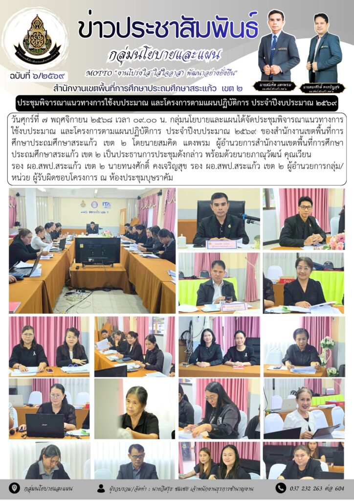 วันศุกร์ที่ ๗ พฤศจิกายน ๒๕๖๘ เวลา ๐๙.๐๐ น. กลุ่มนโยบายและแผนได้จัดประชุมพิจารณาแนวทางการใช้งบประมาณ และโครงการตามแผนปฏิบัติการ ประจำปีงบประมาณ ๒๕๖๙ ของสำนักงานเขตพื้นที่การศึกษาประถมศึกษาสระแก้ว เขต ๒ โดยนายสมคิด แตงพรม ผู้อำนวยการสำนักงานเขตพื้นที่การศึกษาประถมศึกษาสระแก้ว เขต ๒ เป็นประธานการประชุมดังกล่าว พร้อมด้วยนายภาณุวัฒน์ คุณเวียน รอง ผอ.สพป.สระแก้ว เขต ๒ นายทนงศักดิ์ คงเจริญสุข รอง ผอ.สพป.สระแก้ว เขต ๒ ผู้อำนวยการกลุ่ม/หน่วย ผู้รับผิดชอบโครงการ