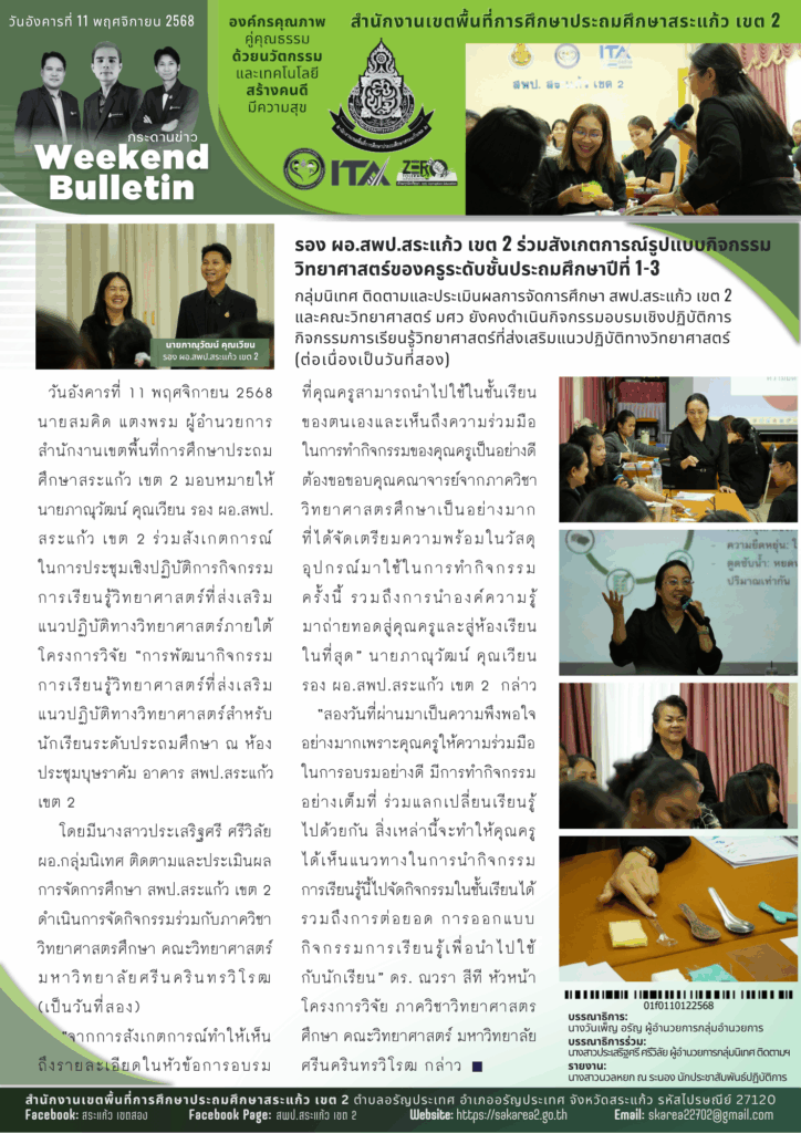 วันอังคารที่ 11 พฤศจิกายน 2568 นายสมคิด แตงพรม ผู้อำนวยการสำนักงานเขตพื้นที่การศึกษาประถมศึกษาสระแก้ว เขต 2 มอบหมายให้นายภาณุวัฒน์ คุณเวียน รอง ผอ.สพป.สระแก้ว เขต 2 ร่วมสังเกตการณ์ในการประชุมเชิงปฏิบัติการกิจกรรมการเรียนรู้วิทยาศาสตร์ที่ส่งเสริมแนวปฏิบัติทางวิทยาศาสตร์ภายใต้โครงการวิจัย “การพัฒนากิจกรรมการเรียนรู้วิทยาศาสตร์ที่ส่งเสริมแนวปฏิบัติทางวิทยาศาสตร์สำหรับนักเรียนระดับประถมศึกษา ณ ห้องประชุมบุษราคัม อาคาร สพป.สระแก้ว เขต 2 โดยมีนางสาวประเสริฐศรี ศรีวิลัย ผอ.กลุ่มนิเทศ ติดตามและประเมินผลการจัดการศึกษา สพป.สระแก้ว เขต 2 ดำเนินการจัดกิจกรรมร่วมกับภาควิชาวิทยาศาสตรศึกษา คณะวิทยาศาสตร์ มหาวิทยาลัยศรีนครินทรวิโรฒ (เป็นวันที่สอง)