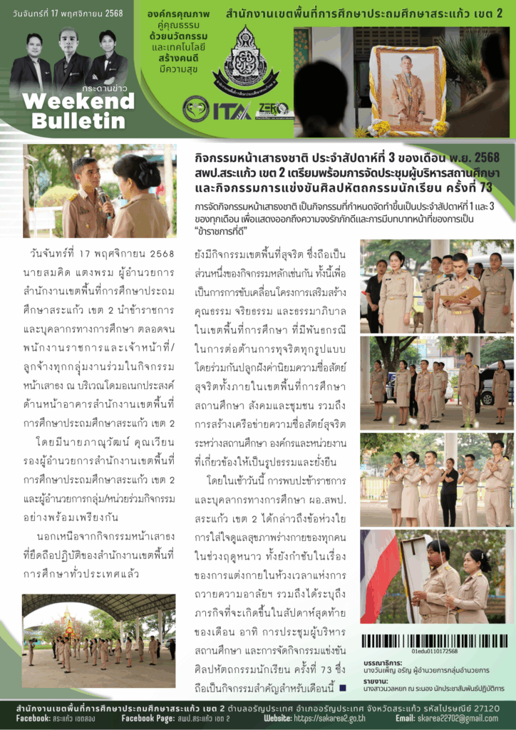 กิจกรรมหน้าเสาธงชาติ ประจำสัปดาห์ที่ 3 ของเดือน พ.ย. 2568 สพป.สระแก้ว เขต 2 เตรียมพร้อมการจัดประชุมผู้บริหารสถานศึกษาและกิจกรรมการแข่งขันศิลปหัตถกรรมนักเรียน ครั้งที่ 73