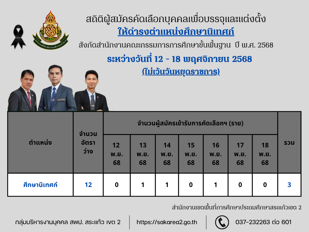 สรุปยอดสถิติจำนวนผู้สมัครเข้ารับการคัดเลือกฯ ตลอดระยะเวลาระหว่างวันที่ 12-18 พฤศจิกายน 2568 มีจำนวนรวมทั้งสิ้น 3 ราย