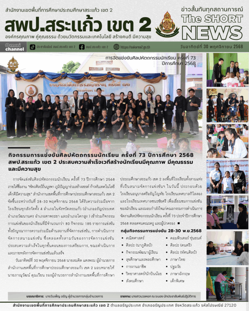 การจัดแข่งขันศิลปหัตถกรรมนักเรียน ครั้งที่ 73 ปีการศึกษา 2568 ภายใต้ชื่องาน “หัตถศิลป์ถิ่นบูรพา ภูมิปัญญาร่วมสร้างสรรค์ ก้าวทันเทคโนโลยี เด็กดีมีความสุข” สำนักงานเขตพื้นที่การศึกษาประถมศึกษาสระแก้ว เขต 2 จัดขึ้นระหว่างวันที่ 28-30 พฤศจิกายน 2568 ได้รับความร่วมมือจากโรงเรียนทุกสังกัดทั้ง 4 อำเภอในจังหวัดสระแก้ว (อำเภออรัญประเทศ อำเภอวัฒนานคร อำเภอตาพระยา และอำเภอโคกสูง ) เข้าร่วมกิจกรรมการแข่งขันของนักเรียนที่มีจำนวนกว่า 80 กิจกรรม 185 รายการแข่งขัน ทั้งยังบูรณาการความร่วมมือด้านสถานที่จัดการแข่งขัน, การดำเนินการจัดการสนามแข่งขัน ซึ่งตลอดทั้งสามวันของการจัดการแข่งขันประสบความสำเร็จในทุกขั้นตอนของการเตรียมการ, ขณะดำเนินการและภายหลังการจัดการแข่งขันแล้วเสร็จ
