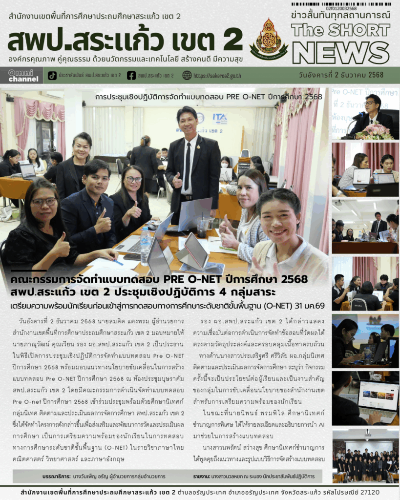 วันอังคารที่ 2 ธันวาคม 2568 นายสมคิด แตงพรม ผู้อำนวยการสำนักงานเขตพื้นที่การศึกษาประถมศึกษาสระแก้ว เขต 2 มอบหมายให้นายภาณุวัฒน์ คุณเวียน รอง ผอ.สพป.สระแก้ว เขต 2 เป็นประธานในพิธีเปิดการประชุมเชิงปฏิบัติการจัดทำแบบทดสอบ Pre O-NET ปีการศึกษา 2568 พร้อมมอบแนวทางนโยบายขับเคลื่อนในการสร้างแบบทดสอบ Pre O-NET ปีการศึกษา 2568 ณ ห้องประชุมบุษราคัม สพป.สระแก้ว เขต 2 โดยมีคณะกรรมการดำเนินจัดทำแบบทดสอบ Pre O-net ปีการศึกษา 2568 เข้าร่วมประชุมพร้อมด้วยศึกษานิเทศก์ กลุ่มนิเทศ ติดตามและประเมินผลการจัดการศึกษา สพป.สระแก้ว เขต 2 ซึ่งได้จัดทำโครงการดังกล่าวขึ้นเพื่อส่งเสริมและพัฒนาการวัดและประเมินผลการศึกษา เป็นการเตรียมความพร้อมของนักเรียนในการทดสอบทางการศึกษาระดับชาติขั้นพื้นฐาน (O-NET) ในรายวิชาภาษาไทย คณิตศาสตร์ วิทยาศาสตร์ และภาษาอังกฤษ