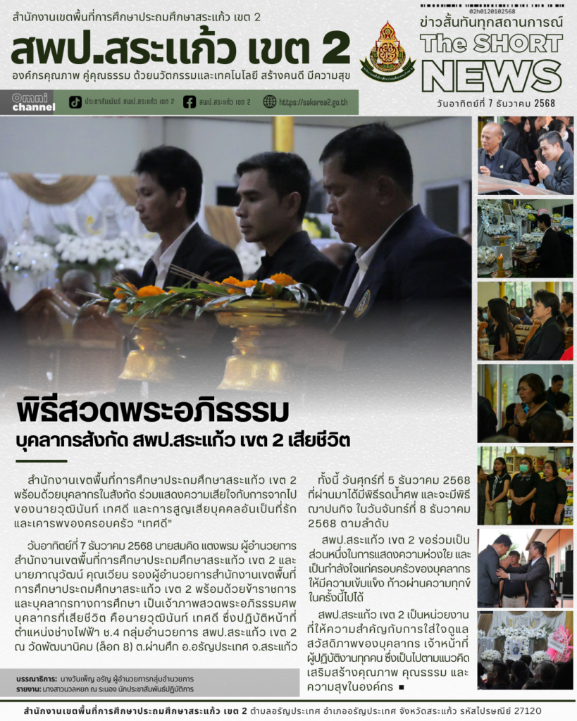 วันอาทิตย์ที่ 7 ธันวาคม 2568 นายสมคิด แตงพรม ผู้อำนวยการสำนักงานเขตพื้นที่การศึกษาประถมศึกษาสระแก้ว เขต 2 และนายภาณุวัฒน์ คุณเวียน รองผู้อำนวยการสำนักงานเขตพื้นที่การศึกษาประถมศึกษาสระแก้ว เขต 2 พร้อมด้วยข้าราชการและบุคลากรทางการศึกษา เป็นเจ้าภาพสวดพระอภิธรรมศพบุคลากรที่เสียชีวิต คือนายวุฒินันท์ เทศดี ซึ่งปฏิบัติหน้าที่ตำแหน่งช่างไฟฟ้า ช.4 กลุ่มอำนวยการ สพป.สระแก้ว เขต 2 ณ วัดพัฒนานิคม (ล็อก 8) ต.ผ่านศึก อ.อรัญประเทศ จ.สระแก้ว