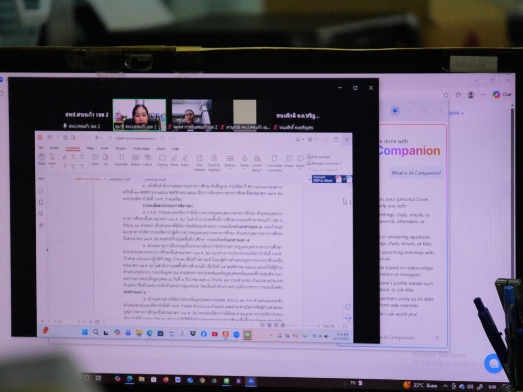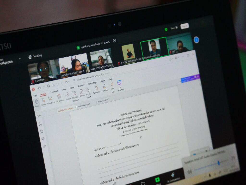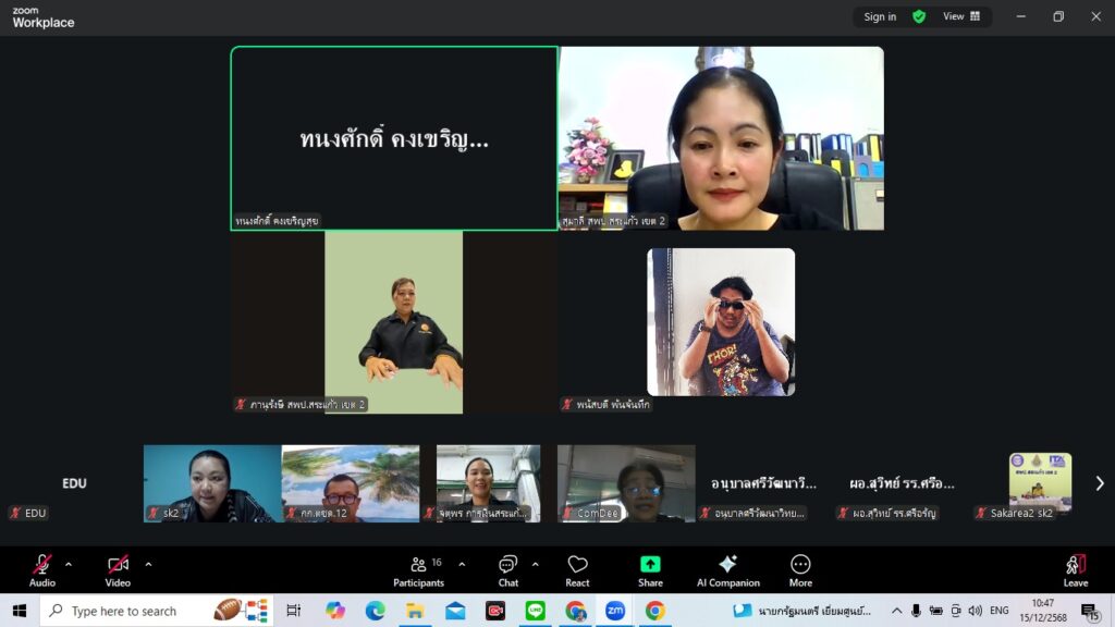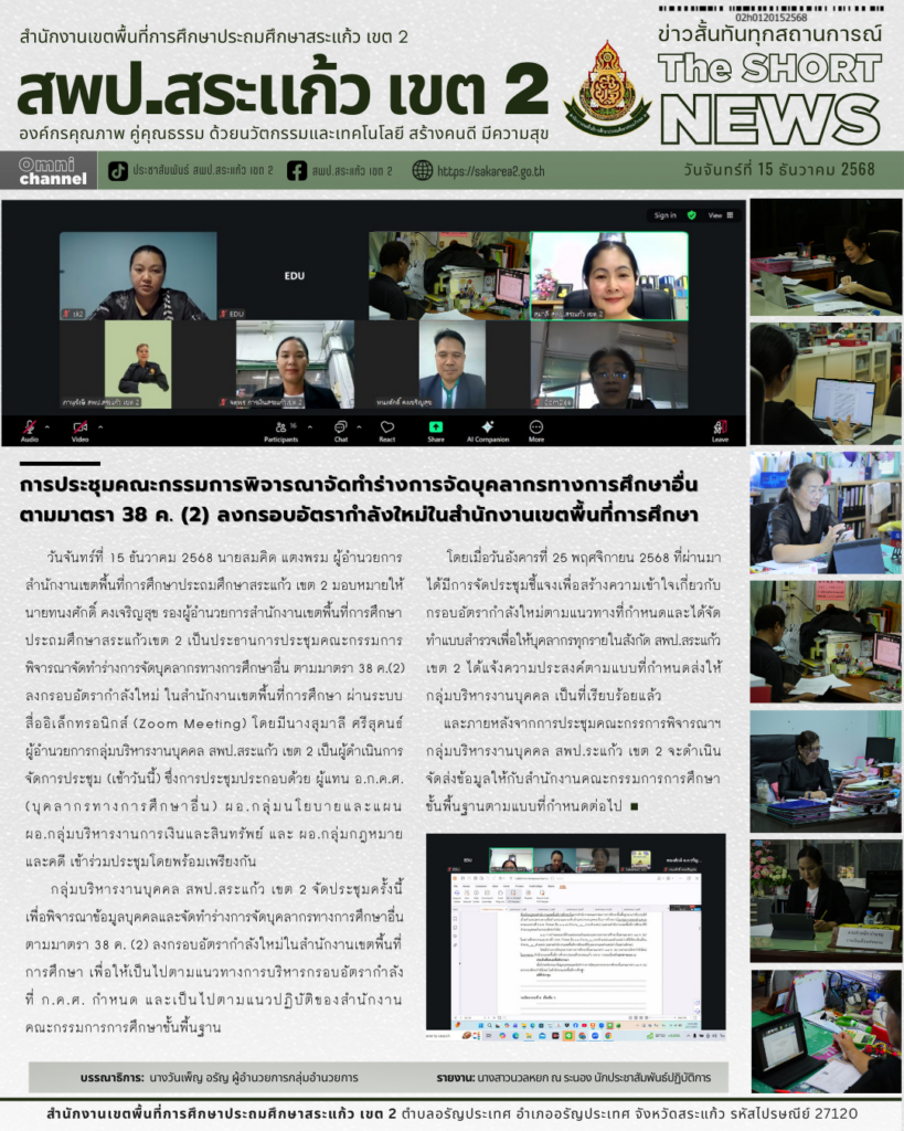 วันจันทร์ที่ 15 ธันวาคม 2568 นายสมคิด แตงพรม ผู้อำนวยการสำนักงานเขตพื้นที่การศึกษาประถมศึกษาสระแก้ว เขต 2 มอบหมายให้นายทนงศักดิ์ คงเจริญสุข รองผู้อำนวยการสำนักงานเขตพื้นที่การศึกษาประถมศึกษาสระแก้วเขต 2 เป็นประธานการประชุมคณะกรรมการพิจารณาจัดทำร่างการจัดบุคลากรทางการศึกษาอื่น ตามมาตรา 38 ค. (2) ลงกรอบอัตรากำลังใหม่ ในสำนักงานเขตพื้นที่การศึกษา ผ่านระบบสื่ออิเล็กทรอนิกส์ (Zoom Meeting) โดยมีนางสุมาลี ศรีสุคนธ์ ผู้อำนวยการกลุ่มบริหารงานบุคคล สพป.สระแก้ว เขต 2 เป็นผู้ดำเนินการจัดการประชุม (เช้าวันนี้) ซึ่งการประชุมประกอบด้วย ผู้แทน อ.ก.ค.ศ. (บุคลากรทางการศึกษาอื่น) ผอ.กลุ่มนโยบายและแผน ผอ.กลุ่มบริหารงานการเงินและสินทรัพย์ และ ผอ.กลุ่มกฎหมายและคดี เข้าร่วมประชุมโดยพร้อมเพรียงกัน