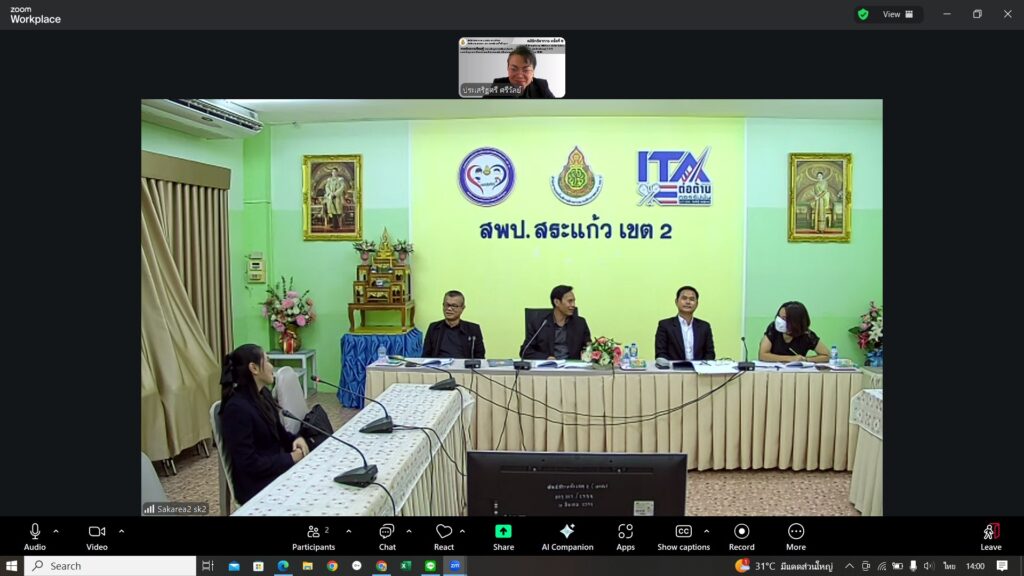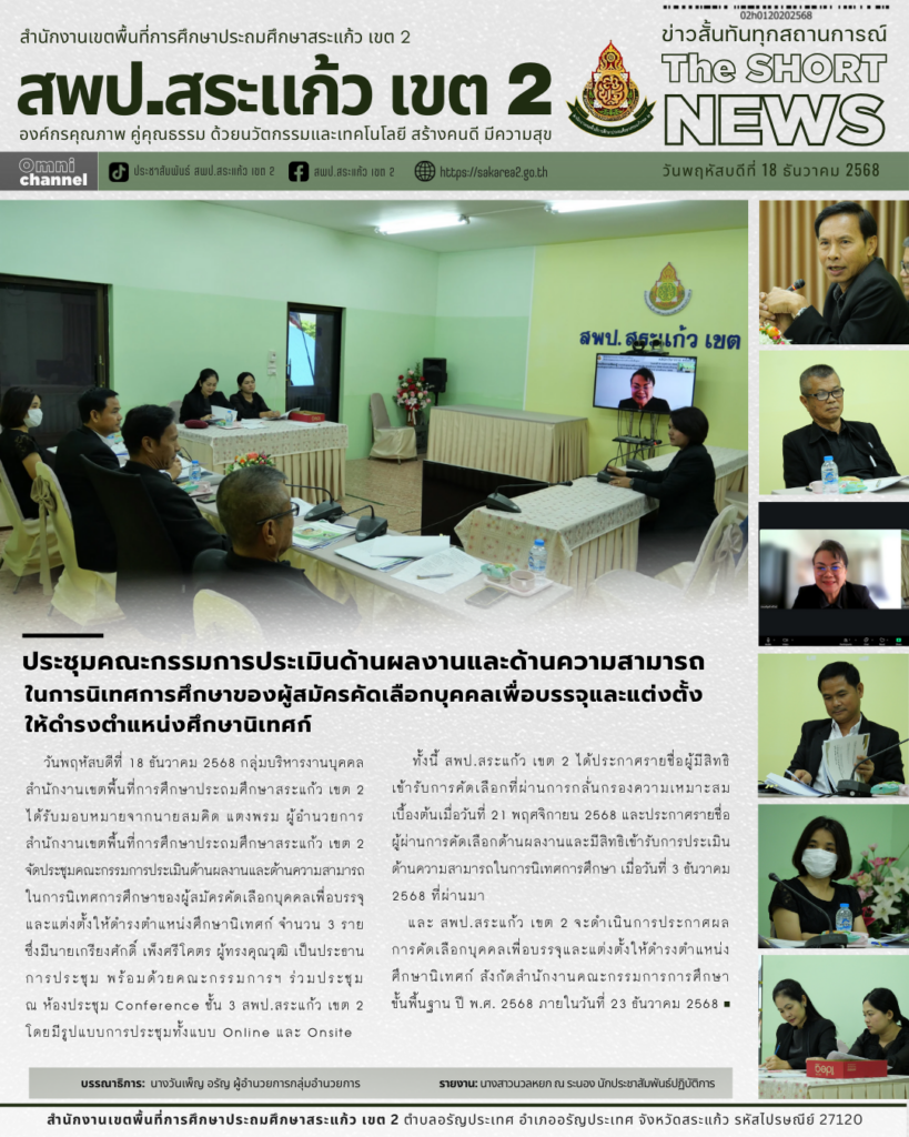 วันพฤหัสบดีที่ 18 ธันวาคม 2568 กลุ่มบริหารงานบุคคล สำนักงานเขตพื้นที่การศึกษาประถมศึกษาสระแก้ว เขต 2 ได้รับมอบหมายจากนายสมคิด แตงพรม ผู้อำนวยการสำนักงานเขตพื้นที่การศึกษาประถมศึกษาสระแก้ว เขต 2 จัดประชุมคณะกรรมการประเมินด้านผลงานและด้านความสามารถในการนิเทศการศึกษาของผู้สมัครคัดเลือกบุคคลเพื่อบรรจุและแต่งตั้งให้ดำรงตำแหน่งศึกษานิเทศก์ จำนวน 3 ราย ซึ่งมีนายเกรียงศักดิ์ เพ็งศรีโคตร ผู้ทรงคุณวุฒิ เป็นประธานการประชุมพร้อมด้วยคณะกรรมการฯ ร่วมประชุม ณ ห้องประชุม Conference ชั้น 3 สพป.สระแก้ว เขต 2 โดยมีรูปแบบการประชุมทั้งแบบ Online และ Onsite