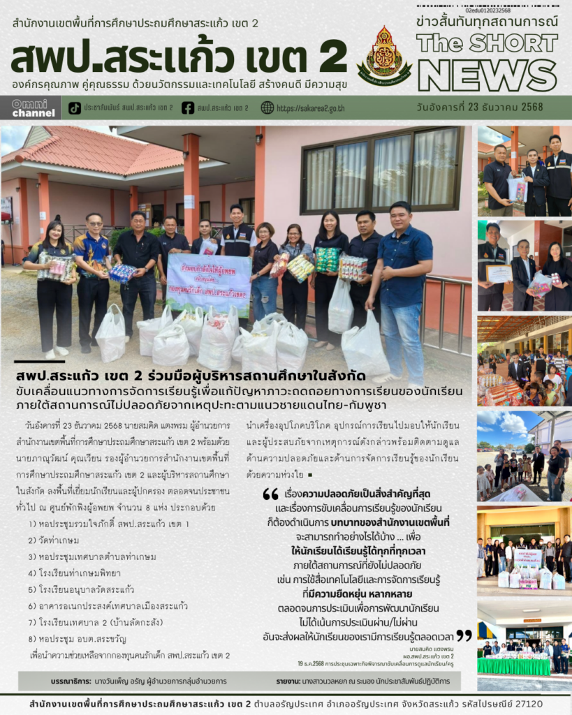 วันอังคารที่ 23 ธันวาคม 2568 นายสมคิด แตงพรม ผู้อำนวยการสำนักงานเขตพื้นที่การศึกษาประถมศึกษาสระแก้ว เขต 2 พร้อมด้วยนายภาณุวัฒน์ คุณเวียน รองผู้อำนวยการสำนักงานเขตพื้นที่การศึกษาประถมศึกษาสระแก้ว เขต 2 และผู้บริหารสถานศึกษาในสังกัด ลงพื้นที่เยี่ยมนักเรียนและผู้ปกครอง ตลอดจนประชาชนทั่วไป ณ ศูนย์พักพิงผู้อพยพ จำนวน 8 แห่ง ประกอบด้วย