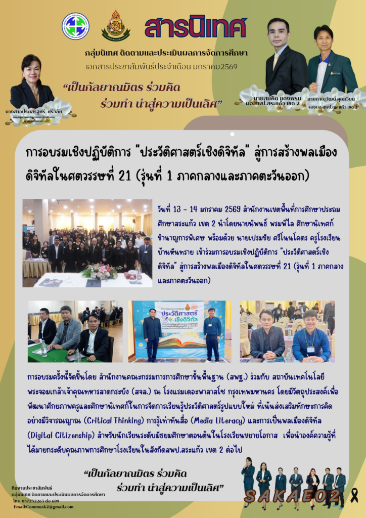 การอบรมเชิงปฏิบัติการ “ประวัติศาสตร์เชิงดิจิทัล” สู่การสร้างพลเมืองดิจิทัลในศตวรรษที่ 21 (รุ่นที่ 1 ภาคกลางและภาคตะวันออก) มกราคม 27, 2026มกราคม 27, 2026 นิเทศติดตามและประเมินผล กลุ่มนิเทศติดตามฯ, วารสาร ประชาสัมพันธ์ Post Views: 11 นิเทศติดตามและประเมินผล