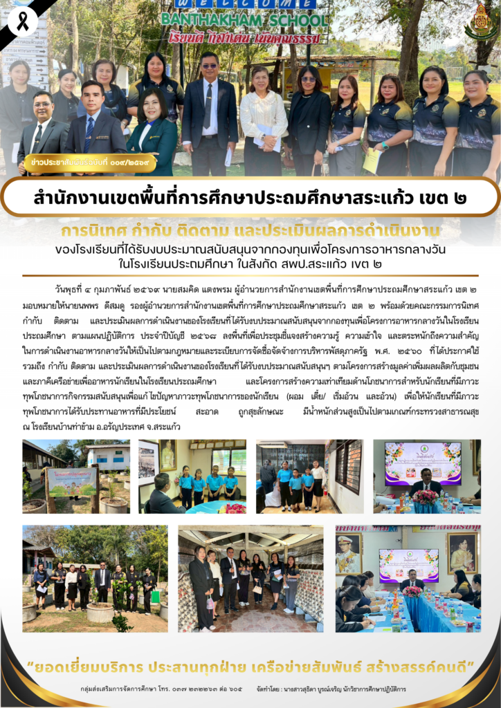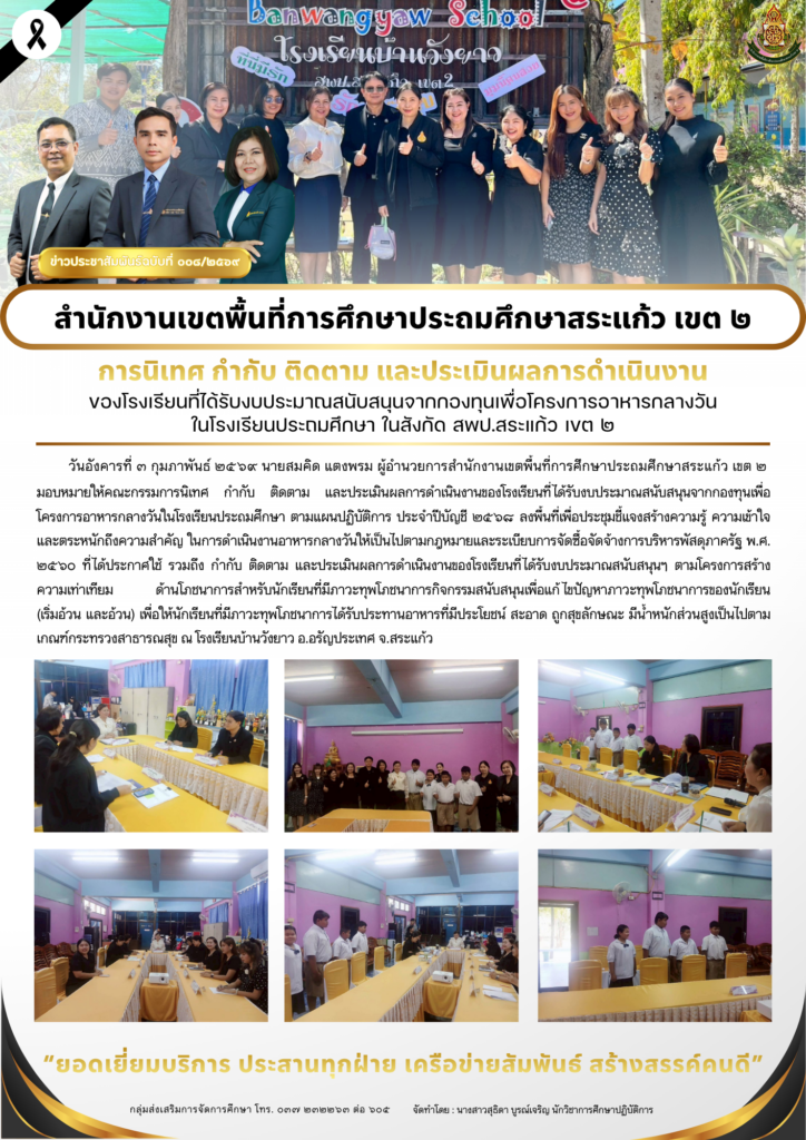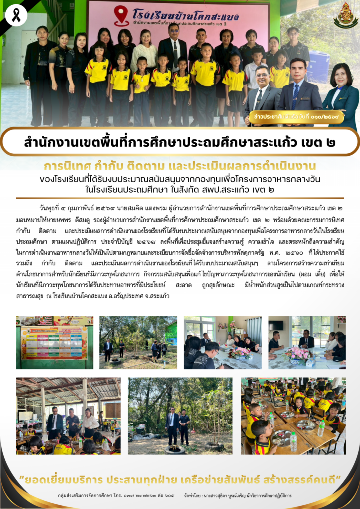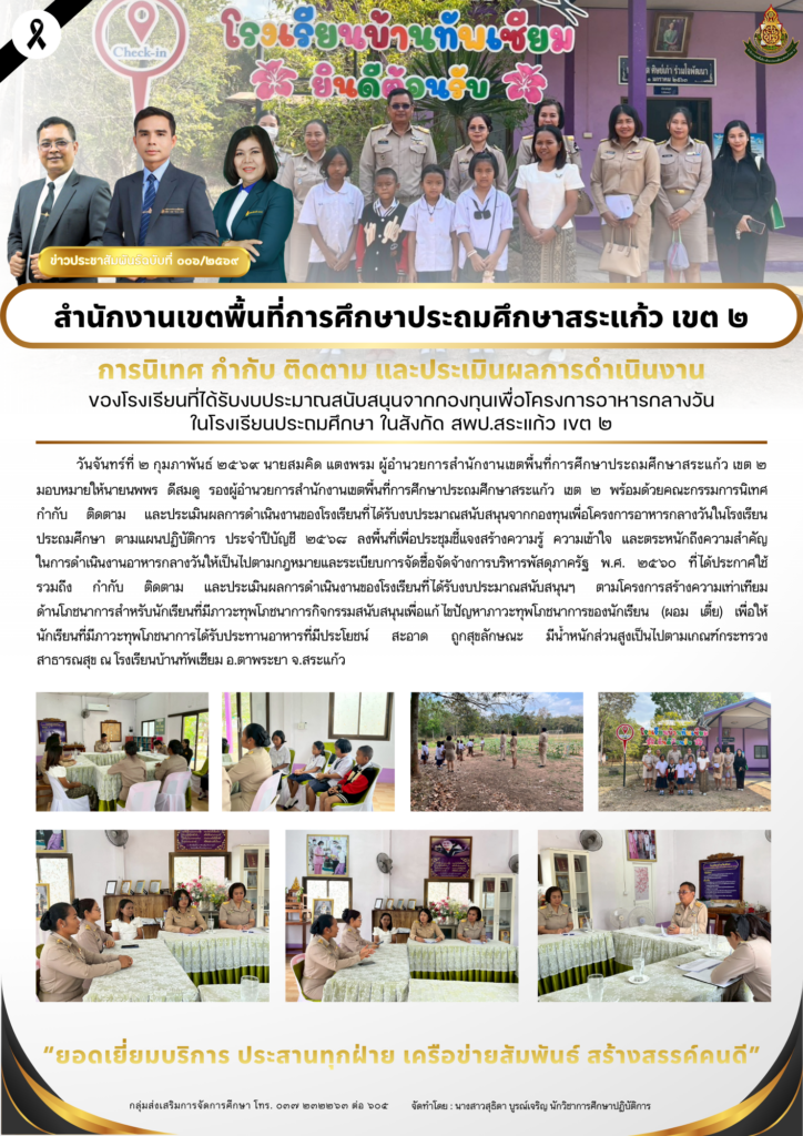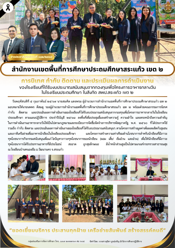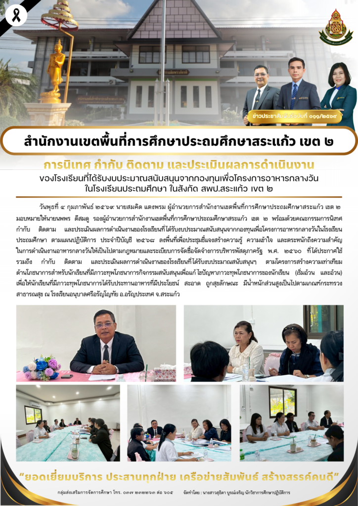 วันจันทร์ที่ ๒ – วันพฤหัสบดีที่ ๕ กุมภาพันธ์ ๒๕๖๙ นายสมคิด แตงพรม ผู้อำนวยการสำนักงานเขตพื้นที่การศึกษาประถมศึกษาสระแก้ว เขต ๒ มอบหมายให้นายนพพร ดีสมดู รองผู้อำนวยการสำนักงานเขตพื้นที่การศึกษาประถมศึกษาสระแก้ว เขต ๒ พร้อมด้วยคณะกรรมการนิเทศ กำกับ ติดตาม และประเมินผลการดำเนินงานของโรงเรียนที่ได้รับงบประมาณสนับสนุนจากกองทุนเพื่อโครงการอาหารกลางวันในโรงเรียนประถมศึกษา ตามแผนปฏิบัติการ ประจำปีบัญชี ๒๕๖๘ ลงพื้นที่เพื่อประชุมชี้แจงสร้างความรู้ ความเข้าใจ และตระหนักถึงความสำคัญ ในการดำเนินงานอาหารกลางวันให้เป็นไปตามกฎหมายและระเบียบการจัดซื้อจัดจ้างการบริหารพัสดุภาครัฐ พ.ศ. ๒๕๖๐ ที่ได้ประกาศใช้ รวมถึง กำกับ ติดตาม และประเมินผลการดำเนินงานของโรงเรียนที่ได้รับงบประมาณสนับสนุนฯ ตามโครงการสร้างมูลค่าเพิ่มผลผลิตกับชุมชนและภาคีเครือข่ายเพื่ออาหารนักเรียนในโรงเรียนประถมศึกษา และโครงการสร้างความเท่าเทียมด้านโภชนาการสำหรับนักเรียนที่มีภาวะ ทุพโภชนาการกิจกรรมสนับสนุนเพื่อแก้ไขปัญหาภาวะทุพโภชนาการของนักเรียน (ผอม เตี้ย/ เริ่มอ้วน และอ้วน) เพื่อให้นักเรียนที่มีภาวะทุพโภชนาการได้รับประทานอาหารที่มีประโยชน์ สะอาด ถูกสุขลักษณะ มีน้ำหนักส่วนสูงเป็นไปตามเกณฑ์กระทรวงสาธารณสุข ณ โรงเรียนเพียงหลวง ๑๗ (บ้านแส์ง) โรงเรียนบ้านทัพเซียม โรงเรียนนิคมสงเคราะห์ ๒ โรงเรียนบ้านวังยาว โรงเรียนบ้านท่าข้าม โรงเรียนบ้านโคกสะแบง โรงเรียนอนุบาลศรีอรัญโญทัย และโรงเรียนบ้านหนองเรือ จ.สระแก้ว
