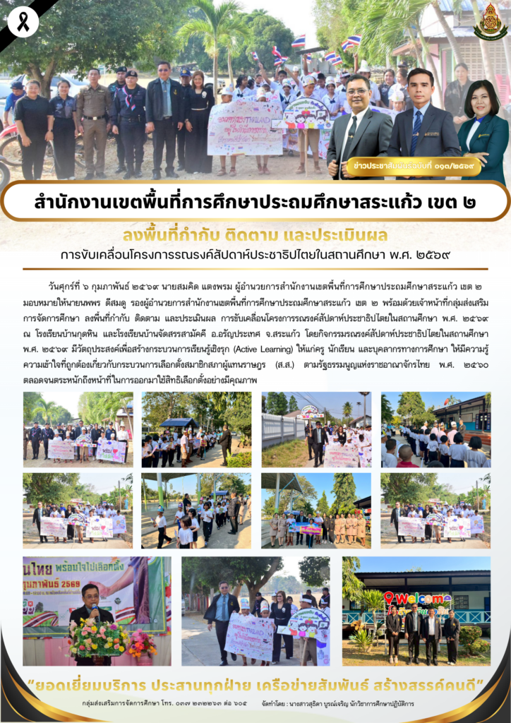 วันศุกร์ที่ ๖ กุมภาพันธ์ ๒๕๖๙ นายสมคิด แตงพรม ผู้อำนวยการสำนักงานเขตพื้นที่การศึกษาประถมศึกษาสระแก้ว เขต ๒ มอบหมายให้นายนพพร ดีสมดู รองผู้อำนวยการสำนักงานเขตพื้นที่การศึกษาประถมศึกษาสระแก้ว เขต ๒ พร้อมด้วยเจ้าหน้าที่กลุ่มส่งเสริมการจัดการศึกษา ลงพื้นที่กำกับ ติดตาม และประเมินผล การขับเคลื่อนโครงการรณรงค์สัปดาห์ประชาธิปไตยในสถานศึกษา พ.ศ. ๒๕๖๙ ณ โรงเรียนบ้านกุดหิน และโรงเรียนบ้านจัดสรรสามัคคี อ.อรัญประเทศ จ.สระแก้ว โดยกิจกรรมรณรงค์สัปดาห์ประชาธิปไตยในสถานศึกษา พ.ศ. ๒๕๖๙ มีวัตถุประสงค์เพื่อสร้างกระบวนการเรียนรู้เชิงรุก (Active Learning) ให้แก่ครู นักเรียน และบุคลากรทางการศึกษา ให้มีความรู้ความเข้าใจที่ถูกต้องเกี่ยวกับกระบวนการเลือกตั้งสมาชิกสภาผู้แทนราษฎร (ส.ส.) ตามรัฐธรรมนูญแห่งราชอาณาจักรไทย พ.ศ. ๒๕๖๐ ตลอดจนตระหนักถึงหน้าที่ในการออกมาใช้สิทธิเลือกตั้งอย่างมีคุณภาพ