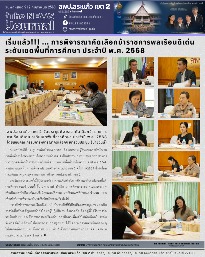 วันพฤหัสบดีที่ 12 กุมภาพันธ์ 2569 นายสมคิด แตงพรม ผู้อำนวยการสำนักงานเขตพื้นที่การศึกษาประถมศึกษาสระแก้ว เขต 2 เป็นประธานการประชุมคณะกรรมการพิจารณาคัดเลือกข้าราชการพลเรือนดีเด่น ระดับเขตพื้นที่การศึกษา ประจำปี พ.ศ. 2568 สำนักงานเขตพื้นที่การศึกษาประถมศึกษาสระแก้ว เขต 2 ครั้งที่ 1/2569 ซึ่งจัดโดยกลุ่มพัฒนาครูและบุคลากรทางการศึกษา สพป.สระแก้ว เขต 2