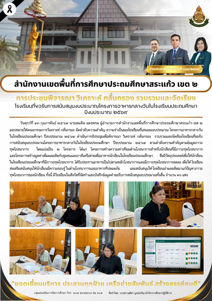 วันศุกร์ที่ ๑๓ กุมภาพันธ์ ๒๕๖๙ นายสมคิด แตงพรม ผู้อำนวยการสำนักงานเขตพื้นที่การศึกษาประถมศึกษาสระแก้ว เขต ๒ มอบหมายให้คณะกรรมการวิเคราะห์ กลั่นกรอง จัดลำดับความสำคัญ ความจำเป็นของโรงเรียนที่เสนอของบประมาณ โครงการอาหารกลางวันในโรงเรียนประถมศึกษา ปีงบประมาณ ๒๕๖๙ ดำเนินการจัประชุมเพื่อพิจารณา วิเคราะห์ กลั่นกรอง รวบรวมและจัดเรียงโรงเรียนที่ขอรับ การสนับสนุนงบประมาณโครงการอาหารกลางวันในโรงเรียนประถมศึกษา ปีงบประมาณ ๒๕๖๙ ตามลำดับความสำคัญตามข้อมูลภาวะ ทุพโภชนาการ โดยแบ่งเป็น ๒ โครงการ ได้แก่ โครงการสร้างความเท่าเทียมด้านโภชนาการสำหรับนักเรียนที่มีภาวะทุพโภชนาการ และโครงการสร้างมูลค่าเพิ่มผลผลิตกับชุมชนและภาคีเครือข่ายเพื่ออาหารนักเรียนในโรงเรียนประถมศึกษา ซึ่งมีวัตถุประสงค์เพื่อให้นักเรียน ในโรงเรียนประถมศึกษาที่มีภาวะทุพโภชนาการ ได้รับประทานอาหารเป็นไปตามหลักโภชนาการและมีภาวะทุพโภชนาการลดลง เพื่อให้โรงเรียนส่งเสริมสนับสนุนให้นักเรียนมีความรอบรู้ในด้านโภชนาการและอาหารที่ปลอดภัย และสนับสนุนให้โรงเรียนนำผลผลิตมาแก้ปัญหาภาวะ ทุพโภชนาการของนักเรียน ทั้งนี้ มีโรงเรียนในสังกัดที่จัดทำและบันทึกข้อมูลคำขอรับการสนับสนุนงบประมาณทั้งสิ้น จำนวน ๑๖ แห่ง