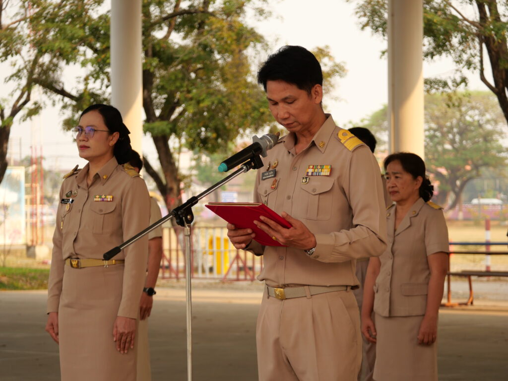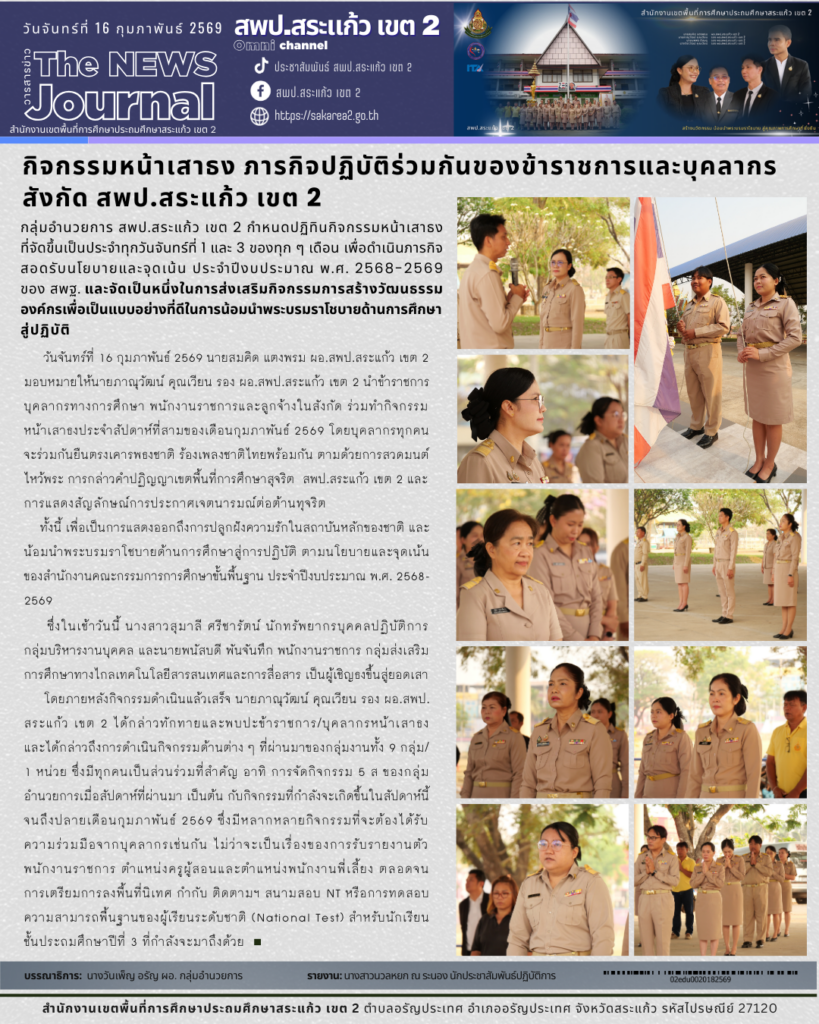วันจันทร์ที่ 16 กุมภาพันธ์ 2569 นายสมคิด แตงพรม ผอ.สพป.สระแก้ว เขต 2 มอบหมายให้นายภาณุวัฒน์ คุณเวียน รอง ผอ.สพป.สระแก้ว เขต 2 นำข้าราชการ บุคลากรทางการศึกษา พนักงานราชการและลูกจ้างในสังกัด ร่วมทำกิจกรรมหน้าเสาธงประจำสัปดาห์ที่สามของเดือนกุมภาพันธ์ 2569 โดยบุคลากรทุกคนจะร่วมกันยืนตรงเคารพธงชาติ ร้องเพลงชาติไทยพร้อมกัน ตามด้วยการสวดมนต์ไหว้พระ การกล่าวคำปฏิญญาเขตพื้นที่การศึกษาสุจริต สพป.สระแก้ว เขต 2 และการแสดงสัญลักษณ์การประกาศเจตนารมณ์ต่อต้านทุจริต