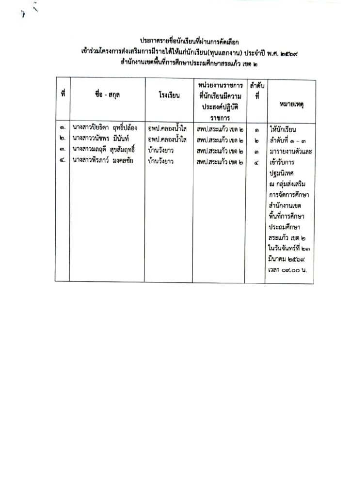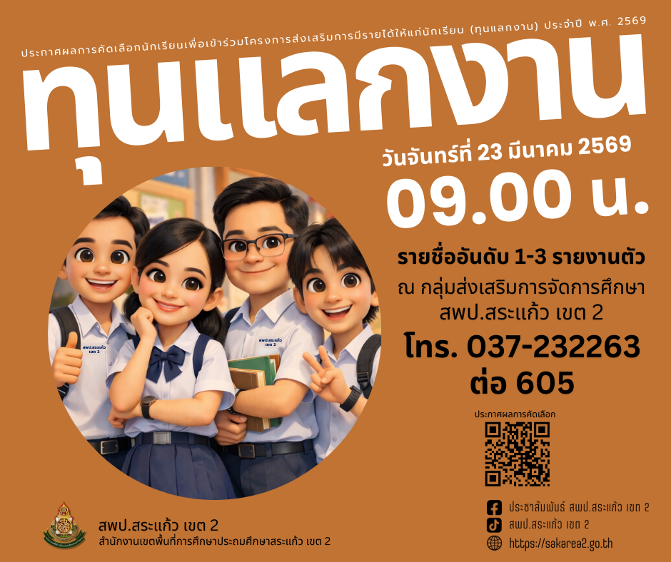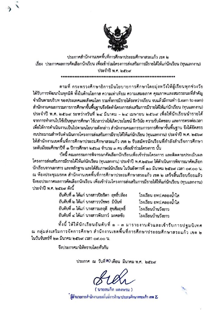 สพป.สระแก้ว เขต 2 ประกาศผลการคัดเลือกนักเรียนเพื่อเข้าร่วมโครงการส่งเสริมการมีรายได้ให้แก่นักเรียน (ทุนแลกงาน) ประจำปี พ.ศ. 2569 จากผลการพิจารณาคัดเลือกของคณะกรรมการพิจารณาคัดเลือกนักเรียนเพื่อเข้าร่วมโครงการ และติดตามประเมินผลโครงการส่งเสริมการมีรายได้ให้แก่นักเรียน (ทุนแลกงาน) ประจำปี พ.ศ. 2569 ที่ได้ดำเนินการพิจารณาคัดเลือกนักเรียนจากเอกสารและหลักฐานและได้สัมภาษณ์นักเรียน เมื่อวันอังคารที่ 10 มีนาคม 2569 เสร็จสิ้นแล้ว โดยมีรายละเอียดดังนี้