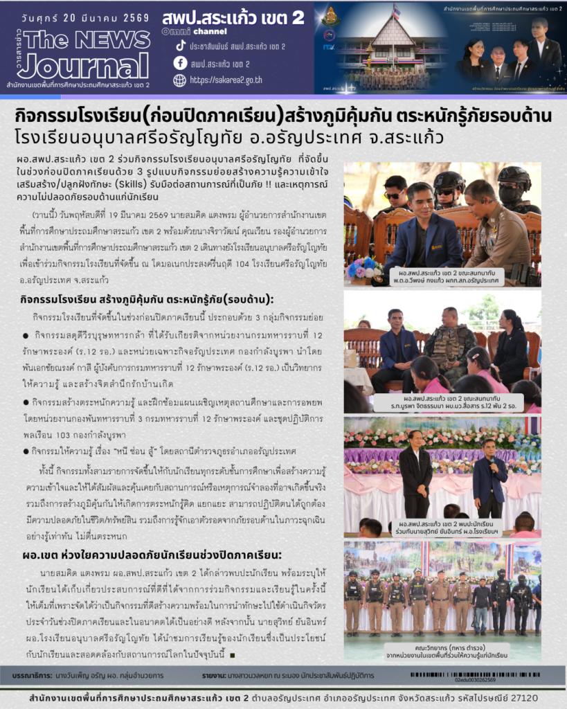 (วานนี้) วันพฤหัสบดีที่ 19 มีนาคม 2569 นายสมคิด แตงพรม ผู้อำนวยการสำนักงานเขตพื้นที่การศึกษาประถมศึกษาสระแก้ว เขต 2 พร้อมด้วยนางจิราวัฒน์ คุณเวียน รองผู้อำนวยการสำนักงานเขตพื้นที่การศึกษาประถมศึกษาสระแก้ว เขต 2 เดินทางยังโรงเรียนอนุบาลศรีอรัญโญทัย เพื่อเข้าร่วมกิจกรรมโรงเรียนที่จัดขึ้น ณ โดมอเนกประสงค์รื่นฤดี 104 โรงเรียนศรีอรัญโญทัย อ.อรัญประเทศ จ.สระแก้ว